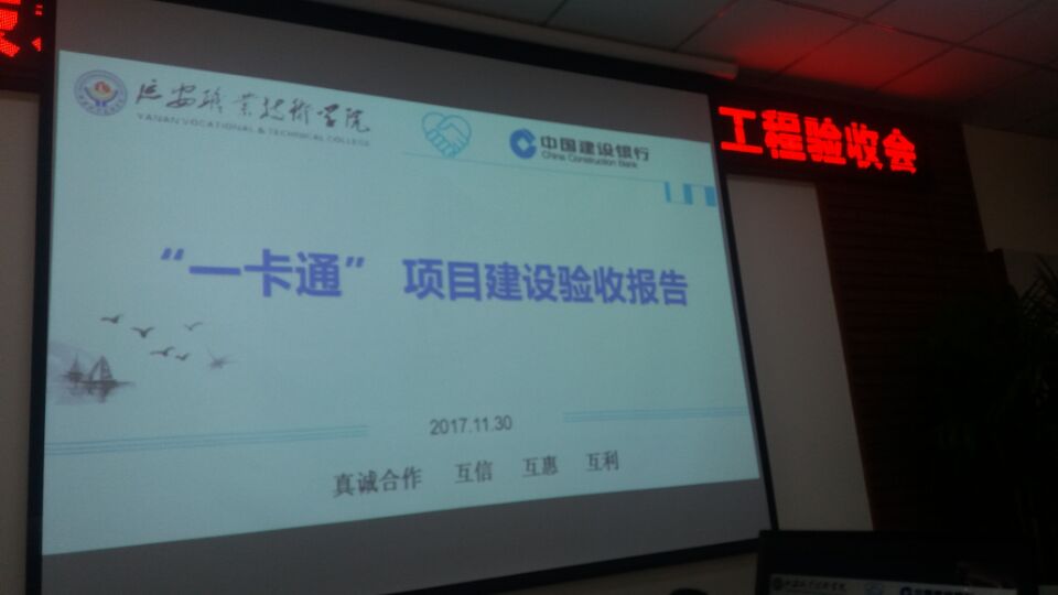 2017年11月30日下午3点,延安职业技术学院校园一卡通项目一期工程验收会在办公楼第四会议室举行。会议由费真副院长主持,建行延安分行李延生副行长、陕西新中新华科电子有限公司霍福吉总经理、学院高福华院长及相关处室负责人等参加了验收会。来自陕西省信息化专家委员种兰祥等五位专家经过查看资料、实物、试运行情况等,宣布验收通过。